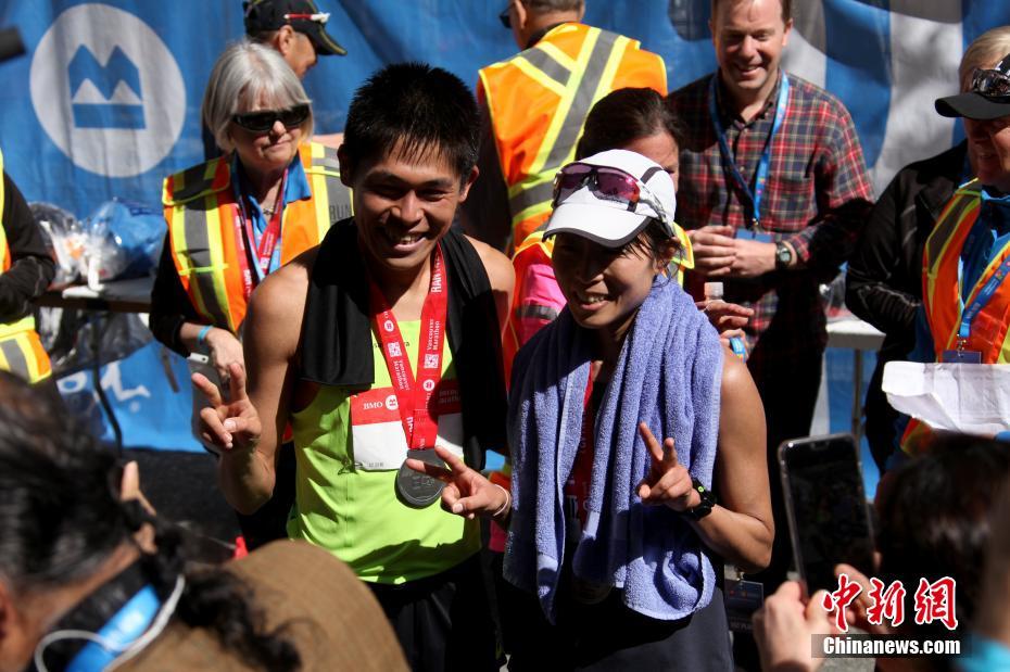 当地时间5月5日,日本选手川内优辉(左)和他的伴侣水口侑子在2019年温哥华马拉松赛中包揽全程马拉松比赛的男、女金牌。来自逾60个国家和地区的超过1.8万名参赛者参加本届温哥华马拉松赛。中新社记者 余瑞冬 摄
