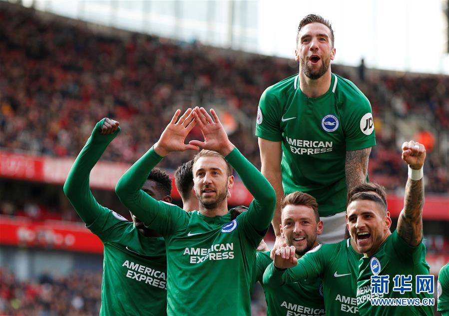 5月5日,布莱顿队球员在进球后庆祝。 当日,在2018-2019赛季英格兰足球超级联赛第37轮比赛中,阿森纳队主场以1比1战平布莱顿队。 新华社/路透