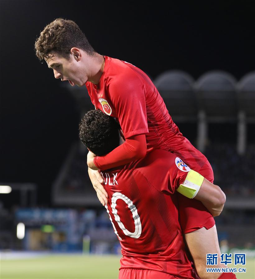 5月7日,上海上港队球员胡尔克(下)在比赛中拥抱队友奥斯卡庆祝进球。 当日,在日本神奈川县川崎市举行的2019亚洲足球冠军联赛H组第五轮比赛中,上海上港队客场以2比2战平川崎前锋队。 新华社记者杜潇逸摄