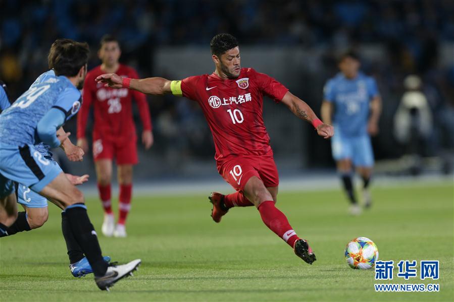 5月7日,上海上港队球员胡尔克(右)在比赛中射门。 当日,在日本神奈川县川崎市举行的2019亚洲足球冠军联赛H组第五轮比赛中,上海上港队客场以2比2战平川崎前锋队。 新华社记者马曹冉摄