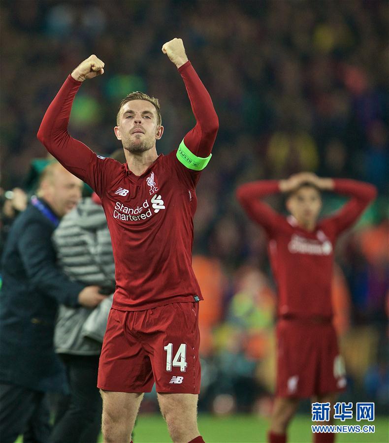 5月7日,利物浦队队长亨德森在比赛后庆祝。 当日,在英国利物浦安菲尔德球场进行的2018-2019赛季欧洲足球冠军联赛半决赛第二回合比赛中,英超利物浦队主场以4比0战胜西甲巴塞罗那队,从而以两回合4比3的总比分上演奇迹逆转,晋级决赛。 新华社发