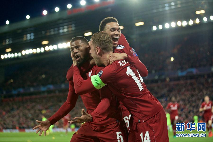 5月7日,利物浦队球员维纳尔杜姆(左)在进球后与队友庆祝。 当日,在英国利物浦安菲尔德球场进行的2018-2019赛季欧洲足球冠军联赛半决赛第二回合比赛中,英超利物浦队主场以4比0战胜西甲巴塞罗那队,从而以两回合4比3的总比分上演奇迹逆转,晋级决赛。 新华社发