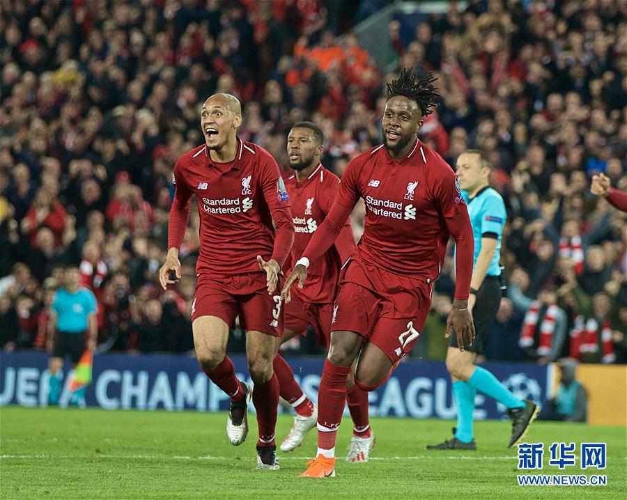 5月7日,利物浦队球员奥里吉(右)在进球后庆祝。 当日,在英国利物浦安菲尔德球场进行的2018-2019赛季欧洲足球冠军联赛半决赛第二回合比赛中,英超利物浦队主场以4比0战胜西甲巴塞罗那队,从而以两回合4比3的总比分上演奇迹逆转,晋级决赛。 新华社发