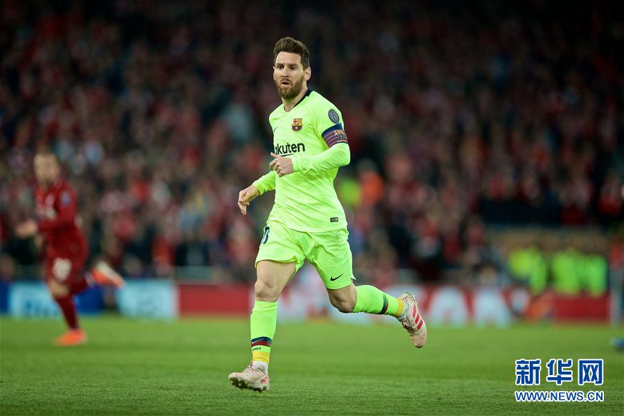 5月7日,巴塞罗那队球员梅西在比赛中。 当日,在英国利物浦安菲尔德球场进行的2018-2019赛季欧洲足球冠军联赛半决赛第二回合比赛中,英超利物浦队主场以4比0战胜西甲巴塞罗那队,从而以两回合4比3的总比分上演奇迹逆转,晋级决赛。 新华社发