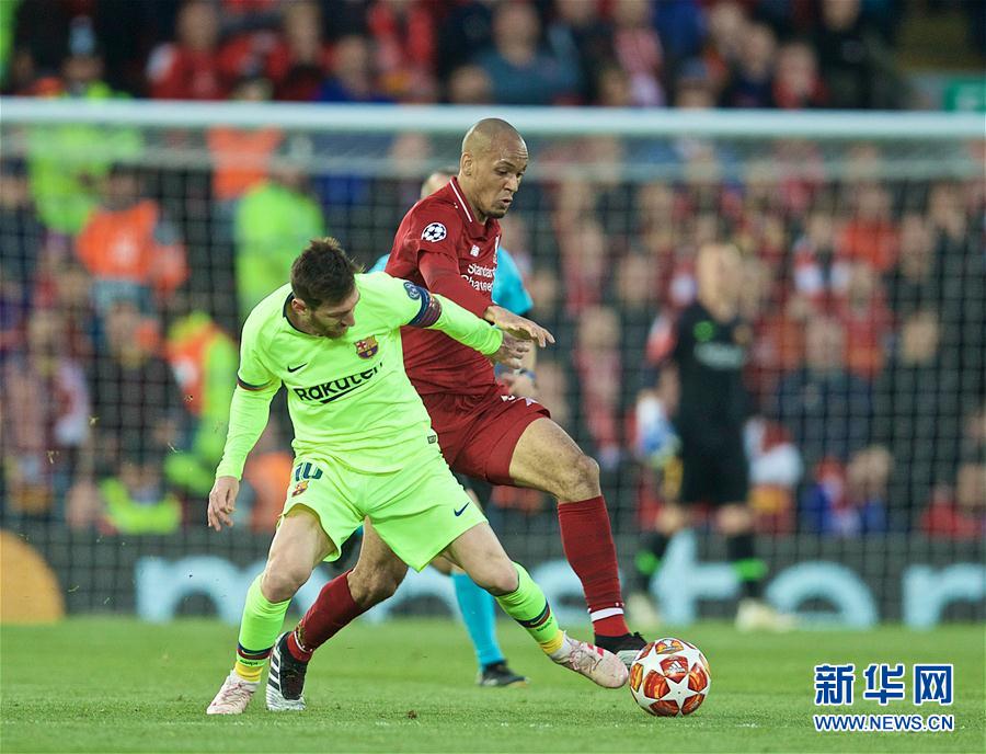 5月7日,利物浦队球员法比尼奥(右)与巴塞罗那队球员梅西拼抢。 当日,在英国利物浦安菲尔德球场进行的2018-2019赛季欧洲足球冠军联赛半决赛第二回合比赛中,英超利物浦队主场以4比0战胜西甲巴塞罗那队,从而以两回合4比3的总比分上演奇迹逆转,晋级决赛。 新华社发