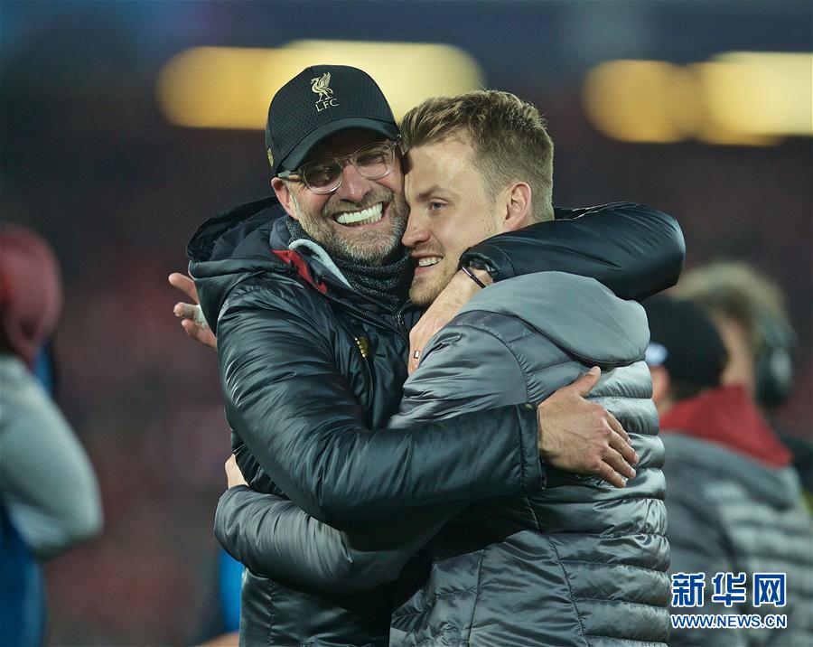5月7日,利物浦队主帅克洛普(左)与门将米尼奥莱赛后庆祝。 当日,在英国利物浦安菲尔德球场进行的2018-2019赛季欧洲足球冠军联赛半决赛第二回合比赛中,英超利物浦队主场以4比0战胜西甲巴塞罗那队,从而以两回合4比3的总比分上演奇迹逆转,晋级决赛。 新华社发