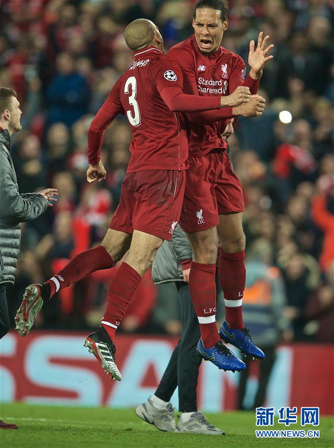 5月7日,利物浦队球员范迪克(右)与法比尼奥(中)在赛后庆祝。 当日,在英国利物浦安菲尔德球场进行的2018-2019赛季欧洲足球冠军联赛半决赛第二回合比赛中,英超利物浦队主场以4比0战胜西甲巴塞罗那队,从而以两回合4比3的总比分上演奇迹逆转,晋级决赛。 新华社发
