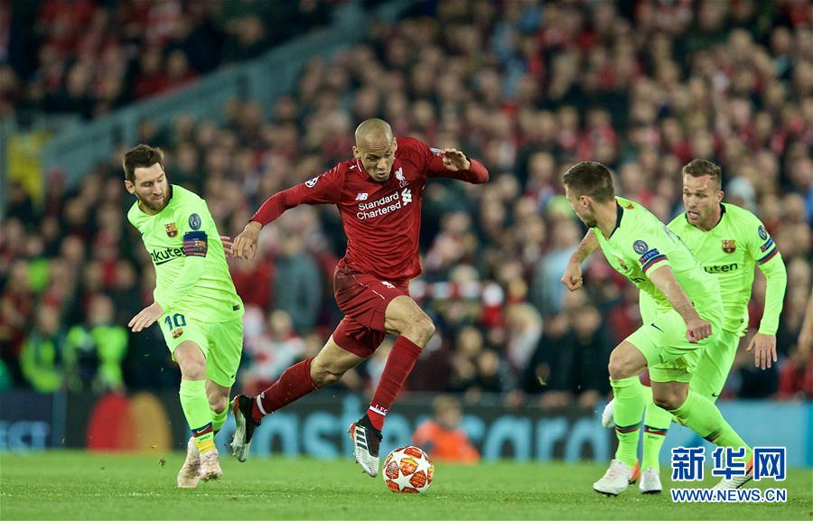 5月7日,利物浦队球员法比尼奥(左二)遭到巴塞罗那队球员梅西(左一)的防守。 当日,在英国利物浦安菲尔德球场进行的2018-2019赛季欧洲足球冠军联赛半决赛第二回合比赛中,英超利物浦队主场以4比0战胜西甲巴塞罗那队,从而以两回合4比3的总比分上演奇迹逆转,晋级决赛。 新华社发
