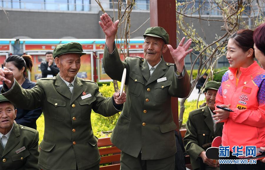 5月9日,92岁的老兵梁三志(中)为中国乒乓球国家队队员刘诗雯(右)等国乒队员演唱军歌。 当日,中国乒乓球协会主席刘国梁带领中国乒协代表、中国乒乓球国家队男女队员及教练员一行35人到访陕西省延安市,开展“祖国在我心中”红色教育活动。在延安,“地表最强战队”相继访问了宝塔山、八一敬老院等地,并与延安大学师生进行了互动和交流。 新华社记者李一博摄