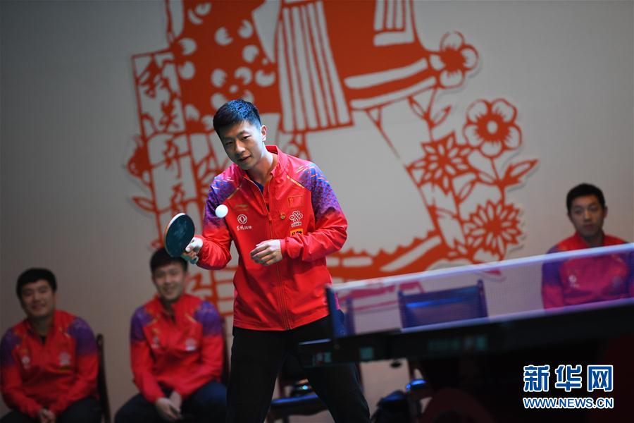 5月9日,中国乒乓球国家队队员马龙(前)在延安大学为师生展示乒乓球技巧。 当日,中国乒乓球协会主席刘国梁带领中国乒协代表、中国乒乓球国家队男女队员及教练员一行35人到访陕西省延安市,开展“祖国在我心中”红色教育活动。在延安,“地表最强战队”相继访问了宝塔山、八一敬老院等地,并与延安大学师生进行了互动和交流。 新华社记者李一博摄