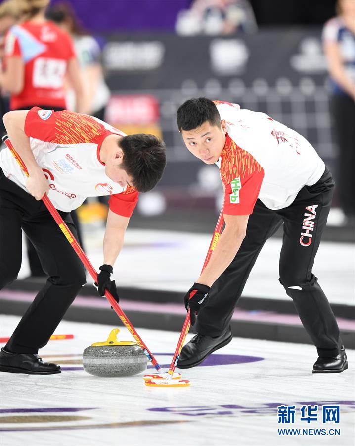 5月10日,中国队选手王智宇(左)和巴德鑫在比赛中擦冰。 当日,在北京举行的2018-2019赛季冰壶世界杯总决赛男子组循环赛中,中国队以0比5不敌瑞典队。 新华社记者贾宇辰摄
