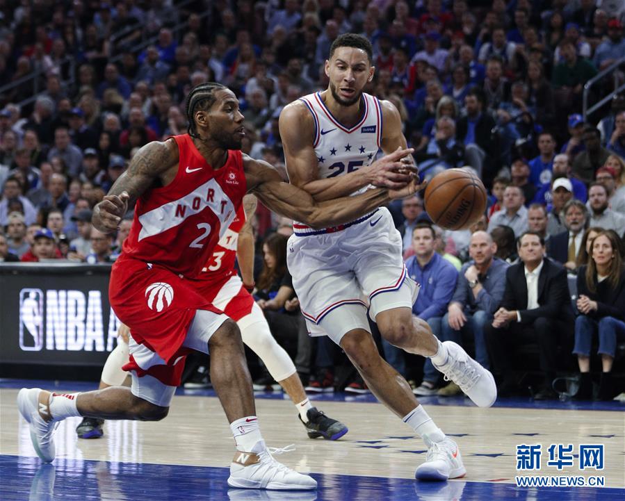 5月9日,猛龙队球员莱昂纳德(左)与76人队球员西蒙斯在比赛中拼抢。 当日,在2019-2019赛季NBA季后赛东部半决赛第六场比赛中,费城76人队主场以112比101战胜多伦多猛龙队,将总比分扳成3比3。 新华社/美联