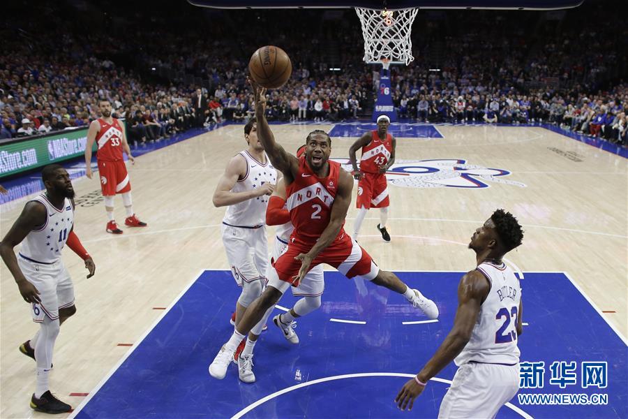 5月9日,猛龙队球员莱昂纳德(中)在比赛中上篮。 当日,在2019-2019赛季NBA季后赛东部半决赛第六场比赛中,费城76人队主场以112比101战胜多伦多猛龙队,将总比分扳成3比3。 新华社/美联