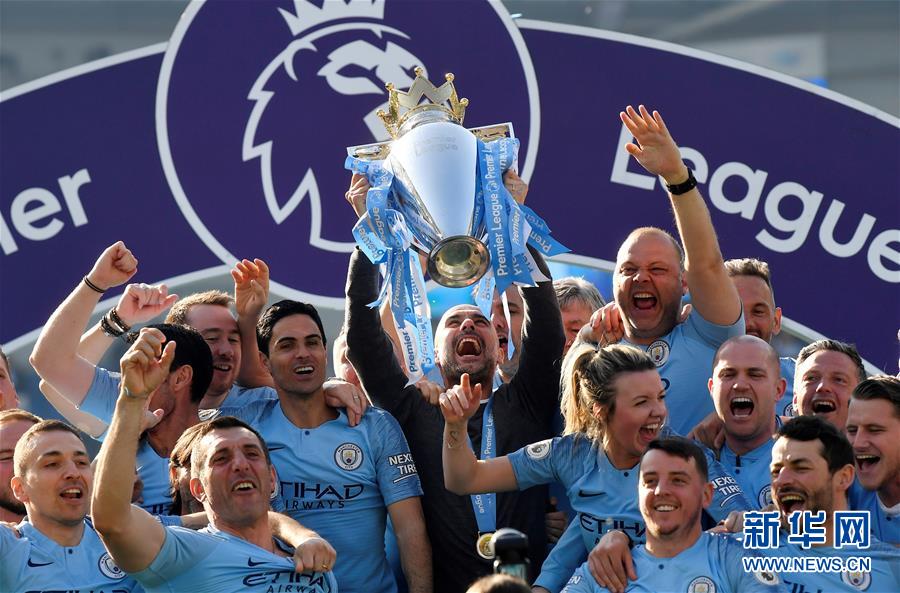 5月12日,曼城队主教练瓜迪奥拉(中)在颁奖仪式上举起冠军奖杯。 当日,在2018-2019赛季英格兰足球超级联赛最后一轮比赛中,曼城队客场以4比1战胜布莱顿队,以总积分98分获得本赛季英超联赛冠军。 新华社/路透
