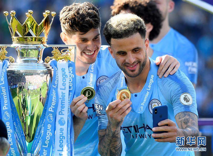 曼城队球员沃克(右)、斯通斯在颁奖仪式上自拍庆祝。新华社/路透