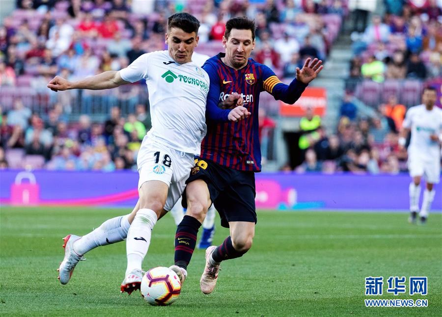 5月12日,巴塞罗那队球员梅西(右)和赫塔菲队球员阿兰巴里在比赛中。 当日,在2018-2019赛季西班牙足球甲级联赛第37轮比赛中,巴塞罗那队主场以2比0战胜赫塔菲队。 新华社发(胡安·戈萨摄)