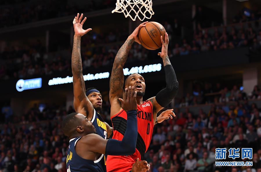 5月12日,开拓者队球员利拉德(右)在比赛中上篮。 当日,在2018-2019赛季NBA季后赛西部半决赛第七场比赛中,波特兰开拓者队客场以100比96战胜丹佛掘金队,从而以总比分4比3晋级西部决赛。 新华社/路透