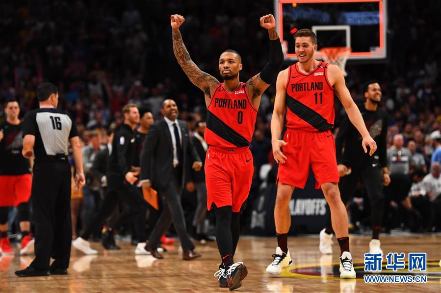 开拓者队球员利拉德(前)在比赛后庆祝。新华社/路透