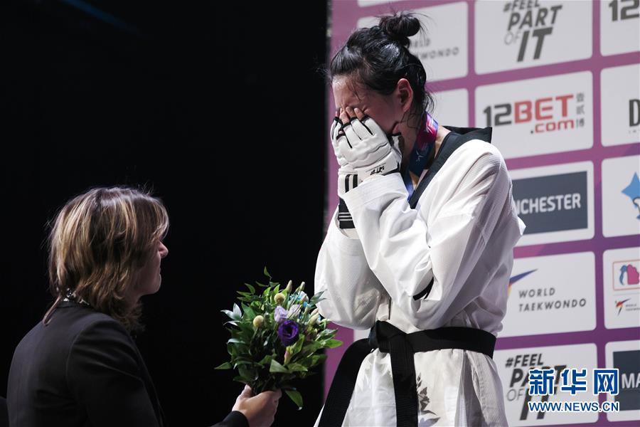 5月17日,郑姝音(右)在领奖台上流泪。 当日,在英国曼彻斯特进行的2019世界跆拳道锦标赛女子73公斤以上级决赛中,中国选手郑姝音对阵英国选手沃克顿。郑姝音遭争议判罚,最终获得银牌,对手沃克顿获得金牌。 新华社发(乔恩·休珀摄)
