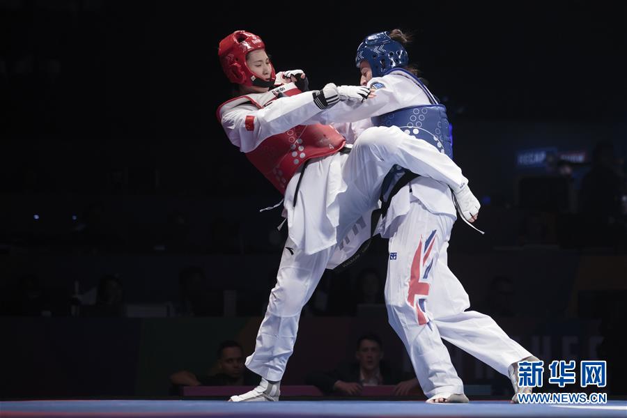 5月17日,郑姝音(左)与沃克顿在比赛中。 当日,在英国曼彻斯特进行的2019世界跆拳道锦标赛女子73公斤以上级决赛中,中国选手郑姝音对阵英国选手沃克顿。郑姝音遭争议判罚,最终获得银牌,对手沃克顿获得金牌。 新华社发(乔恩·休珀摄)