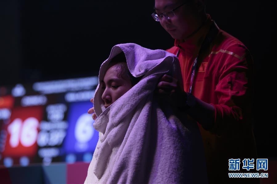 5月17日,郑姝音(前)在比赛间隙。 当日,在英国曼彻斯特进行的2019世界跆拳道锦标赛女子73公斤以上级决赛中,中国选手郑姝音对阵英国选手沃克顿。郑姝音遭争议判罚,最终获得银牌,对手沃克顿获得金牌。 新华社发(乔恩·休珀摄)