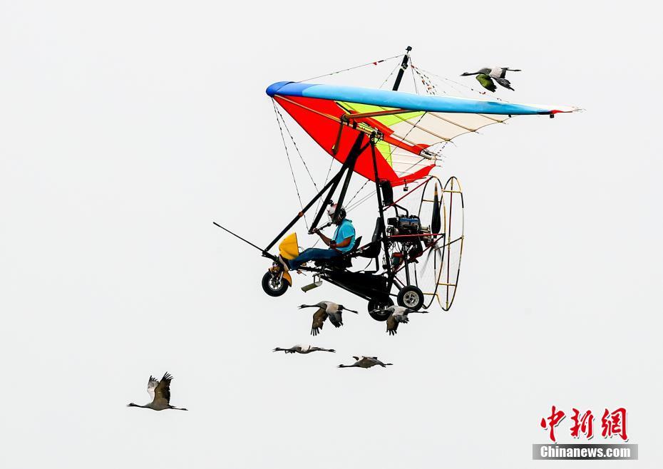 5月18日,“2019年国际航联世界飞行者大会”在位于武汉经济技术开发区的汉南通用机场开幕,来自全球的近700名顶尖飞行员、航空运动员齐聚武汉展开空中炫技。图为大雁与动力悬挂滑翔机一起御风飞翔。中新社记者 张畅 摄