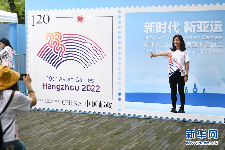 5月18日,工作人员在杭州亚运会首套个性化专用邮票的模型边留影。新华社记者黄宗治摄