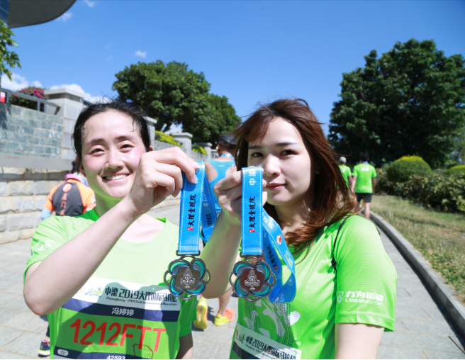 参赛的女子选手展示韵动中国·2019大理国际马拉松半程完赛奖牌。(肖发兴摄)