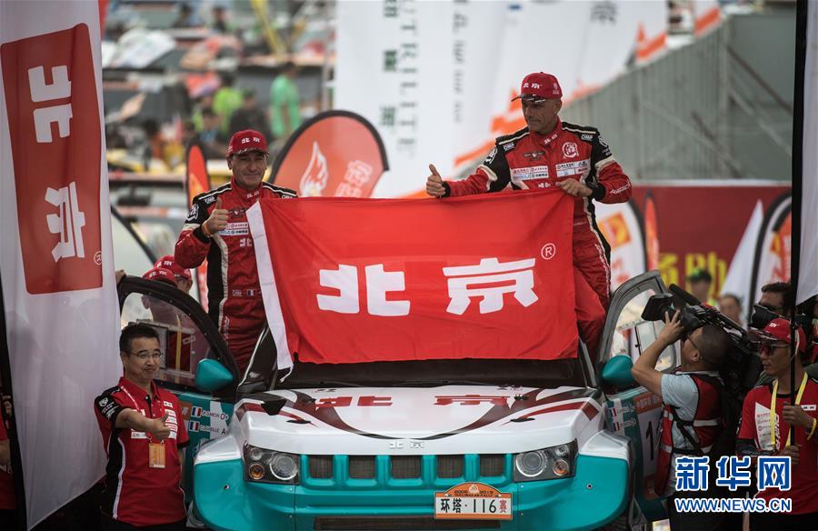 5月19日,北京越野世家车队车手拉维利·克里斯蒂安(右)与领航员加尔桑·让-皮埃尔在发车台合影。 2019年中国环塔(国际)拉力赛19日在新疆阿克苏市发车,各路车手将于未来15天内战高温、穿沙海,于6月2日在新疆和田市收车。本届赛事全程围绕塔克拉玛干沙漠进行,总里程达5000公里,共有9个特殊赛段的比赛,本届赛事汽车组有48支车队101辆赛车参赛,摩托车组10支车队26辆摩托车参赛,车手与领航员共228名。 新华社记者江文耀摄