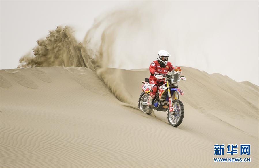 5月20日,八一钢铁长城润滑油车队车手邓江驾驶摩托翻越沙梁。 当日,2019年环塔拉力赛超级短道排位赛开始,赛段全长约58.5公里。今天的比赛成绩决定着明日比赛的发车顺序。 新华社记者胡虎虎摄