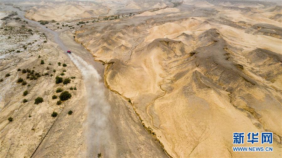 5月20日,赛车行驶在干涸的河床赛道上(无人机拍摄)。 当日,2019年环塔拉力赛超级短道排位赛开始,赛段全长约58.5公里。今天的比赛成绩决定着明日比赛的发车顺序。 新华社记者江文耀摄