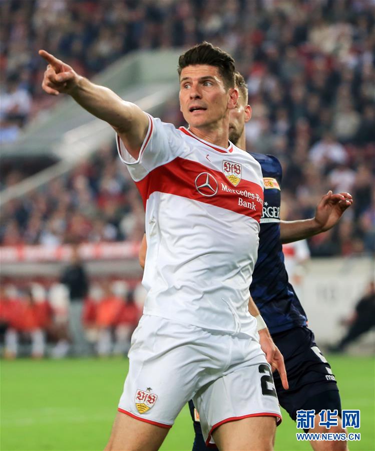 5月23日,斯图加特队球员戈麦斯在比赛中。 当日,在2018-2019赛季德国足球甲级联赛升降级附加赛首回合比赛中,德甲第16名斯图加特队主场与德乙第3名柏林联合队战成2比2平。 新华社发(菲利普·鲁伊兹摄)