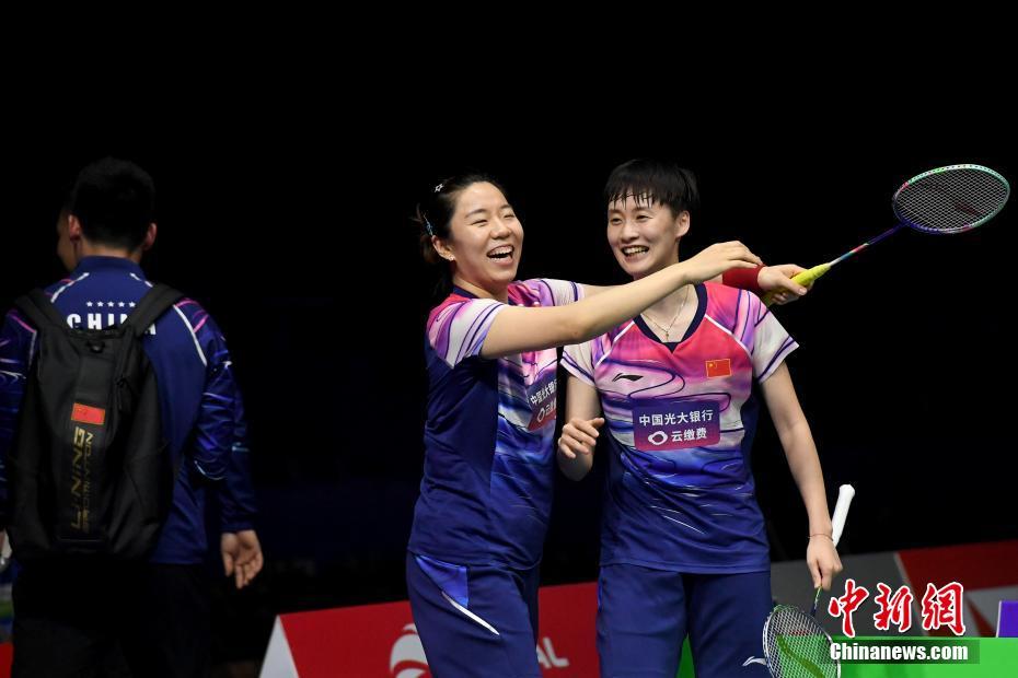 中国队选手陈雨菲在女子单打比赛中,以2比0战胜丹麦队选手米娅。当日,在广西南宁举行的2019年苏迪曼杯世界羽毛球混合团体锦标赛四分之一决赛中,中国队以3比1战胜丹麦队,晋级半决赛。图为陈雨菲(右)等庆祝获胜。