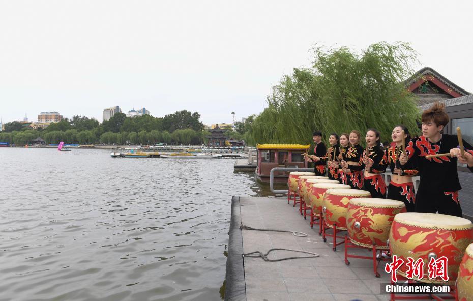 5月24日,2019年全国马拉松游泳冠军赛暨世锦赛公开水域游泳项目选拔赛在济南大明湖风景区举行。据悉,本次比赛专业组项目为10公里、5公里的个人赛和团体赛。图为鼓手为参加女子10公里马拉松游泳赛的选手擂鼓助威。中新社记者 张勇 摄