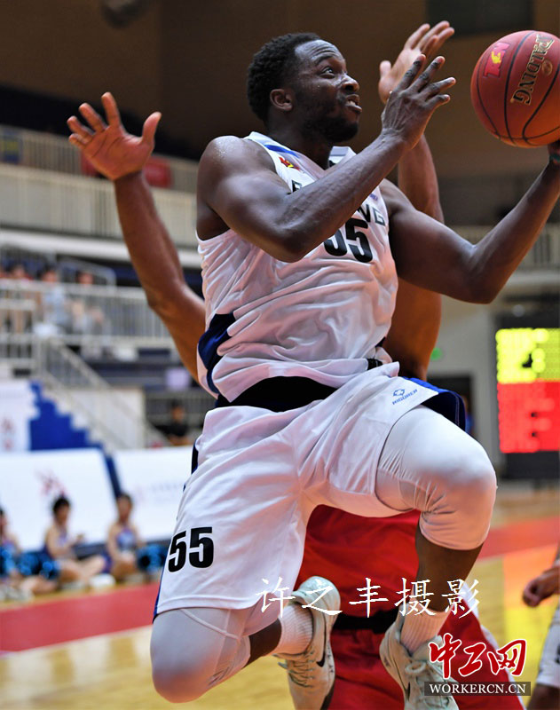 5月24日晚,2019年全国男子篮球联赛(NBL)第3轮比赛北京雄鹿队主场以110比108战胜河南河南赊店老酒队。北京队亚历山大·杨47分6篮板,霍利费尔德18分27篮板,赵政13分,王启鹏10分;河南队约什·阿克格农31分,哈里斯26分23篮板,崔晓龙16分,王龙飞11分。图为双方的比赛瞬间。工人日报-中工网许之丰摄影报道