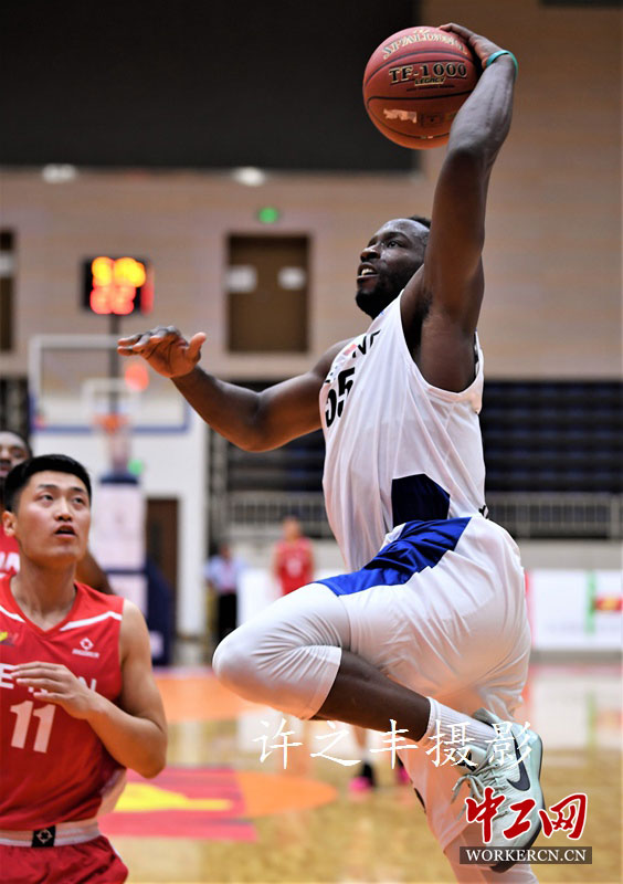 5月24日晚,2019年全国男子篮球联赛(NBL)第3轮比赛北京雄鹿队主场以110比108战胜河南河南赊店老酒队。北京队亚历山大·杨47分6篮板,霍利费尔德18分27篮板,赵政13分,王启鹏10分;河南队约什·阿克格农31分,哈里斯26分23篮板,崔晓龙16分,王龙飞11分。图为双方的比赛瞬间。工人日报-中工网许之丰摄影报道