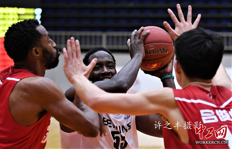 5月24日晚,2019年全国男子篮球联赛(NBL)第3轮比赛北京雄鹿队主场以110比108战胜河南河南赊店老酒队。北京队亚历山大·杨47分6篮板,霍利费尔德18分27篮板,赵政13分,王启鹏10分;河南队约什·阿克格农31分,哈里斯26分23篮板,崔晓龙16分,王龙飞11分。图为双方的比赛瞬间。工人日报-中工网许之丰摄影报道