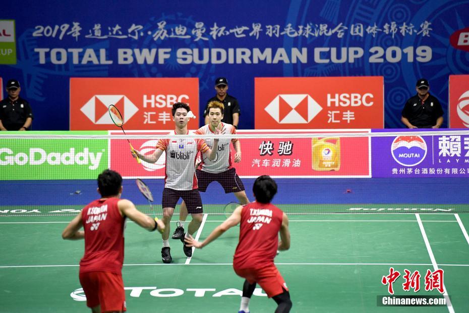 5月25日晚,印度尼西亚队组合吉迪恩/苏卡姆约在男子双打比赛中以2比0战胜日本队组合嘉村健士/园田启悟。当日,在广西南宁举行的2019年苏迪曼杯世界羽毛球混合团体锦标赛半决赛中,日本队以3比1战胜印度尼西亚队,晋级决赛。中新社记者 俞靖 摄