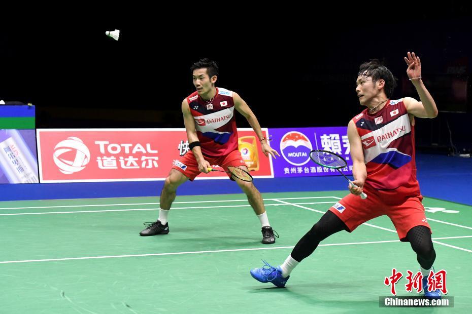 5月25日晚,日本队组合嘉村健士/园田启悟在男子双打比赛中。他们以0比2不敌印度尼西亚队组合吉迪恩/苏卡姆约。当日,在广西南宁举行的2019年苏迪曼杯世界羽毛球混合团体锦标赛半决赛中,日本队以3比1战胜印度尼西亚队,晋级决赛。中新社记者 俞靖 摄