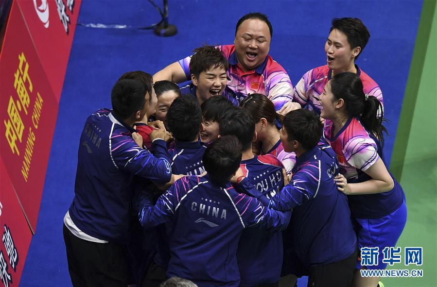 5月26日,中国队在男子单打比赛后庆祝夺冠。 当日,在广西南宁举行的2019年苏迪曼杯世界羽毛球混合团体锦标赛决赛中,中国队以3比0的总比分战胜日本队,第11次捧得苏迪曼杯。 新华社记者孔卉摄
