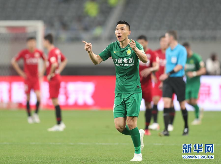5月26日,北京中赫国安队球员于大宝在比赛中庆祝进球。 当日,在2019赛季中超联赛第11轮比赛中,上海上港队主场以2比1战胜北京中赫国安队。 新华社记者丁汀摄