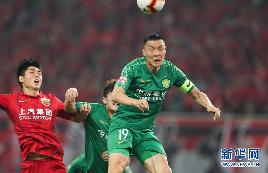 5月26日,北京中赫国安队球员于大宝(右)在比赛中争顶。 当日,在2019赛季中超联赛第11轮比赛中,上海上港队主场以2比1战胜北京中赫国安队。 新华社记者丁汀摄