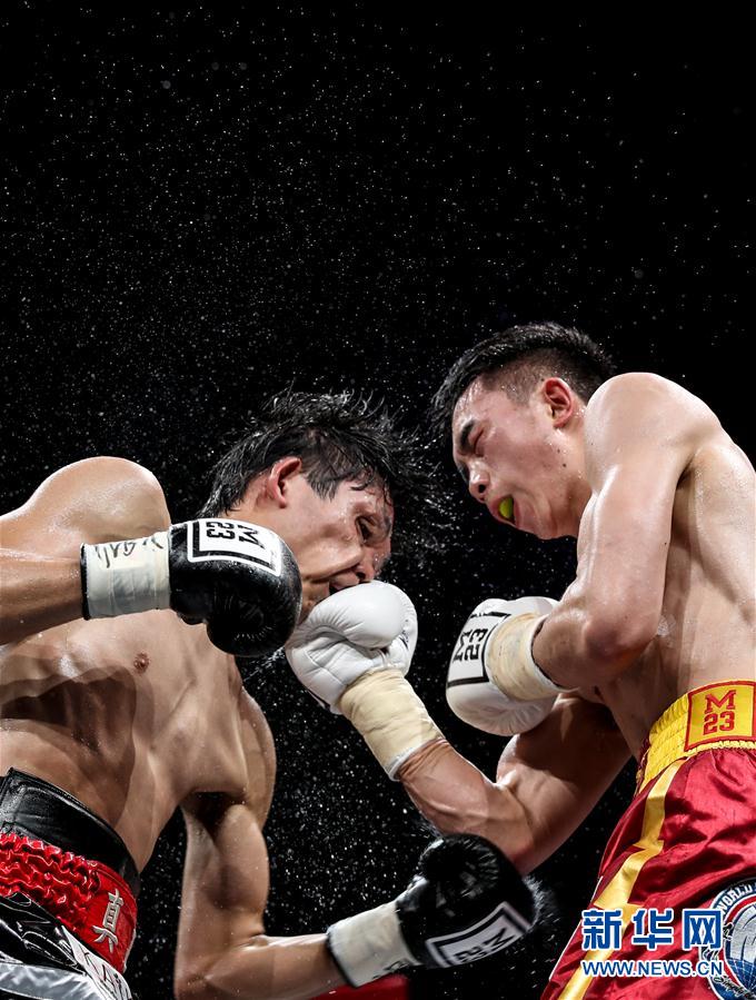 5月26日,中国选手徐灿(右)与日本选手久保隼在比赛中。 当日,中国羽量级世界拳王徐灿在第六回合以技术性击倒(TKO)的方式战胜日本前超雏量级世界拳王、挑战者久保隼,首次卫冕拳王金腰带。 新华社记者吴壮摄