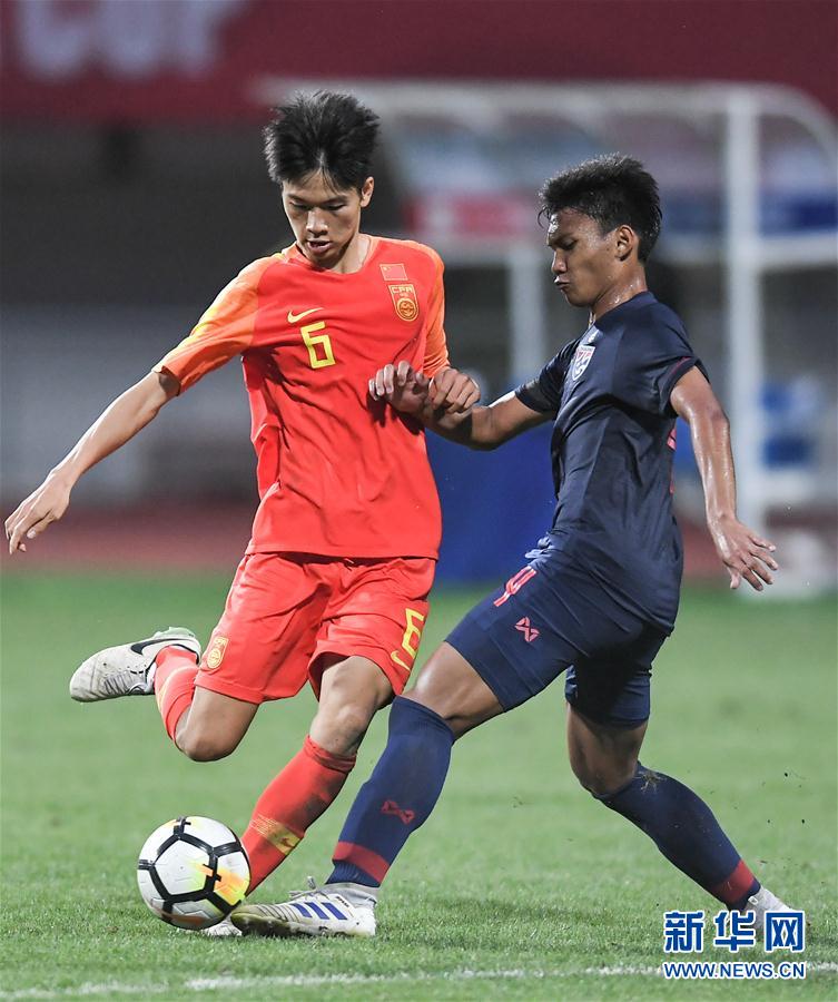 5月27日,中国队球员史堉铖(左)在比赛中。 当日,在四川成都举行的2019“熊猫杯”国际青年足球锦标赛中,中国U18国家队以0比2不敌泰国U18国家队。 新华社记者薛玉斌摄