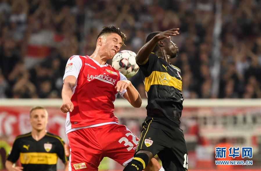 5月27日,柏林联合队球员祖尔伊(左)与斯图加特队球员阿科洛在比赛中争顶。 当日,在2018-2019赛季德国足球甲级联赛升降级附加赛次回合比赛中,德乙第3名柏林联合队主场与德甲第16名斯图加特队战成0比0平。两队两回合总比分为2比2平,柏林联合队凭借客场进球多的优势晋级2019—2020赛季德甲联赛。 新华社发(凯文·福格特摄)