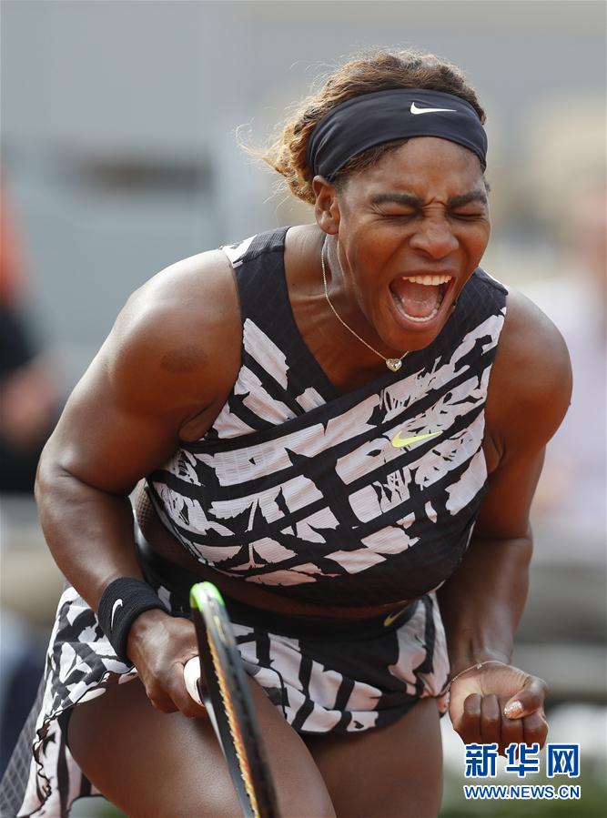 5月27日,小威在比赛中。 当日,在法国巴黎罗兰·加洛斯球场进行的2019年法国网球公开赛女单首轮比赛中,美国选手塞雷娜·威廉姆斯(小威)以2比1战胜俄罗斯选手季亚琴科,逆转晋级。 新华社记者韩岩摄