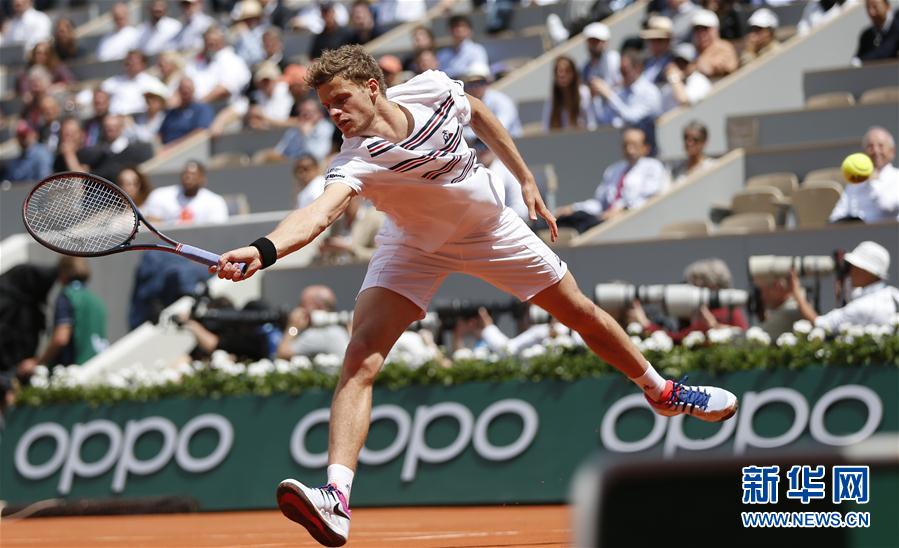 5月27日,汉夫曼在比赛中回球。 当日,在法国巴黎罗兰·加洛斯球场进行的2019年法国网球公开赛男单首轮比赛中,西班牙选手纳达尔以3比0战胜德国选手汉夫曼,进入下一轮。 新华社记者韩岩摄