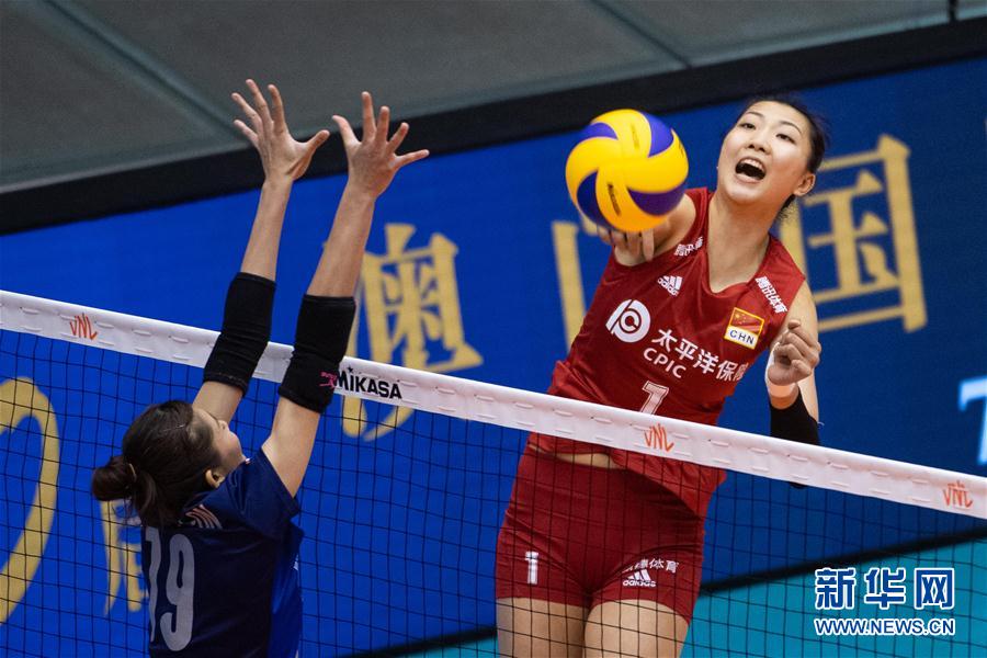 5月28日,中国队球员袁心玥(右)在比赛中扣球。 当日,在澳门综艺馆举行的2019澳门国际排联世界女子排球联赛中,中国队以3比0战胜泰国队。 新华社记者张金加摄