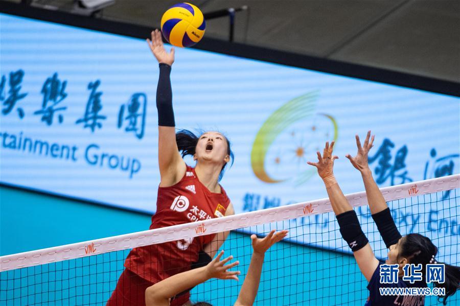5月28日,中国队球员张常宁在比赛中扣球。 当日,在澳门综艺馆举行的2019澳门国际排联世界女子排球联赛中,中国队以3比0战胜泰国队。 新华社记者张金加摄