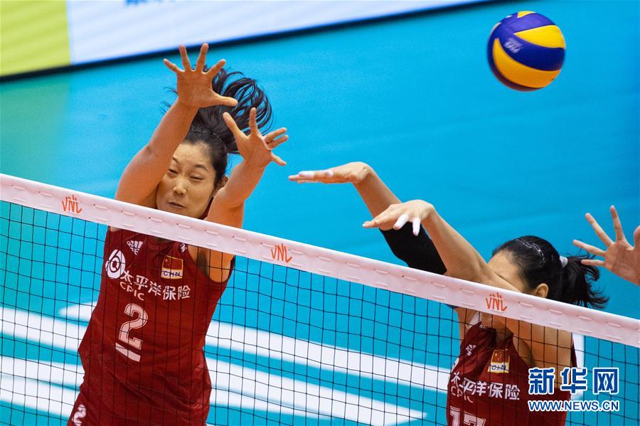 5月28日,中国队球员朱婷(左)在比赛中拦网。 当日,在澳门综艺馆举行的2019澳门国际排联世界女子排球联赛中,中国队以3比0战胜泰国队。 新华社记者张金加摄